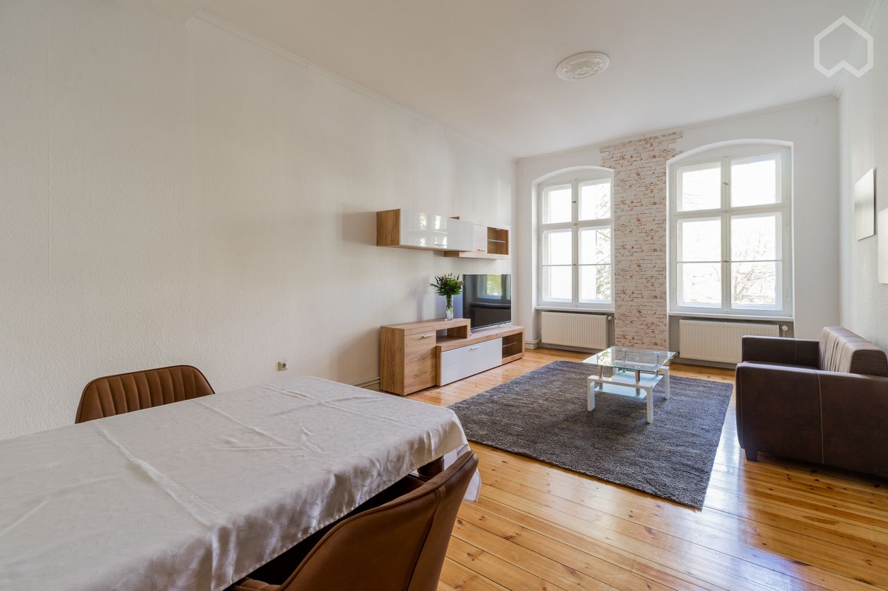 The charming old building apartment was completely renovated. The apartment is located on the 1st floor of the transverse building in the courtyard. The all-inclusive rent of € 1,250.00 includes all operating costs as well as gas and electricity costs. The apartment has been completely furnished - including a fitted kitchen with appliances, crockery and cutlery. (to the devices belong beside stove, oven, refrigerator and microwave also a dishwasher as well as further small devices). All house...