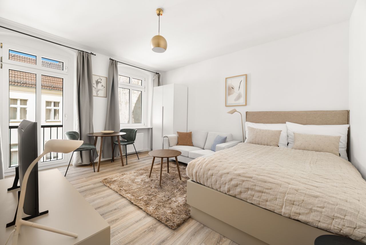 This stunning furnished studio apartment features contemporary design, a fully equipped kitchen, and a cozy living area with breathtaking views. Perfectly situated, you'll have easy access to everything that makes Berlin vibrant and exciting!