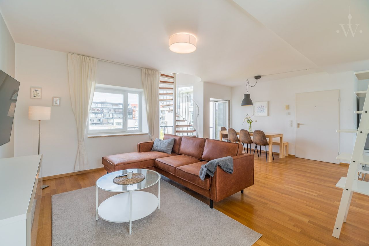 NOTE: For terms of <6 months, accommodation tax of 7.5% is due! This lovingly furnished maisonette apartment is located in the pulsating heart of Berlin. On the lower floor of the apartment you will find a spacious living room with a dining area, a reading corner and an open kitchen. In addition, there is a utility room and a guest WC. The upper floor contains a bathroom with shower as well as two comfortable bedrooms with work area. The roof terrace is the highlight of the apartment, from he...