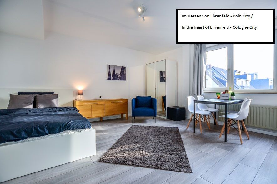 In the heart of Cologne-Ehrenfeld. Fully equipped with a large kitchen, freshly modernized (2019), Smart TV, washing machine in the apartment itself, Tassimo coffee maker, iron, cutlery and cookware, Welcome Package, vacuum cleaner and and and.... Super central location with numerous bars, cafes, restaurants and clubs on the doorstep. Top view, as on the 3rd floor with large window front.