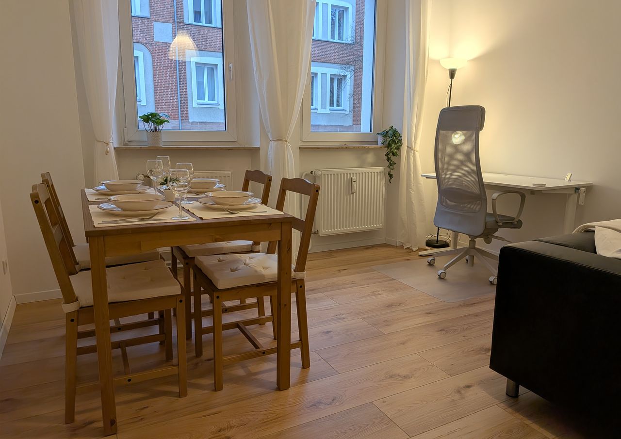 This newly renovated and newly furnished apartment provides enough space for one or two tenants who prefer a quiet neighbourhood while still being able to reach central station (only 12 minutes via public transport) or recreational areas like the municipal park or Wöhrder See (only 10 minutes on foot) quite easily. The bedroom offers a luxurious 160 cm x 200 cm box-spring bed, a wardrobe and a dresser. The kitchen is fully equipped with new cookware, dishes, cutlery and much more. Start your ...