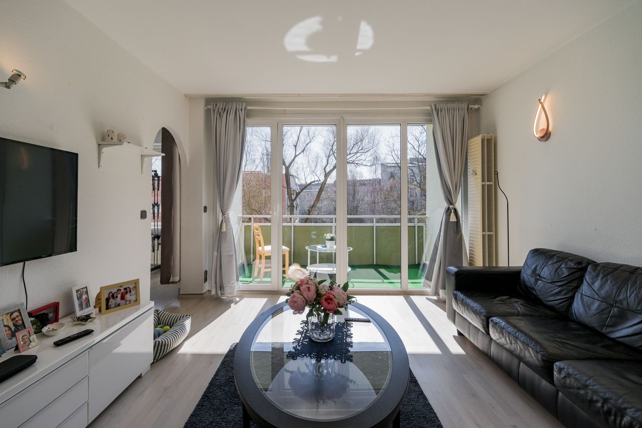 This modern 2 room apartment is located directly opposite the Charlottenburg Palace in a well-kept apartment building. The apartment is located on the 3rd floor and can be reached by elevator, and comes fully furnished with all the amenities. The Living room is furnished with a leather couch, coffee table and TV, and contains floor to ceiling windows with green views and access to the balcony. The beautiful fitted kitchen includes a built-in refrigerator, washing machine, dryer, dishwasher...