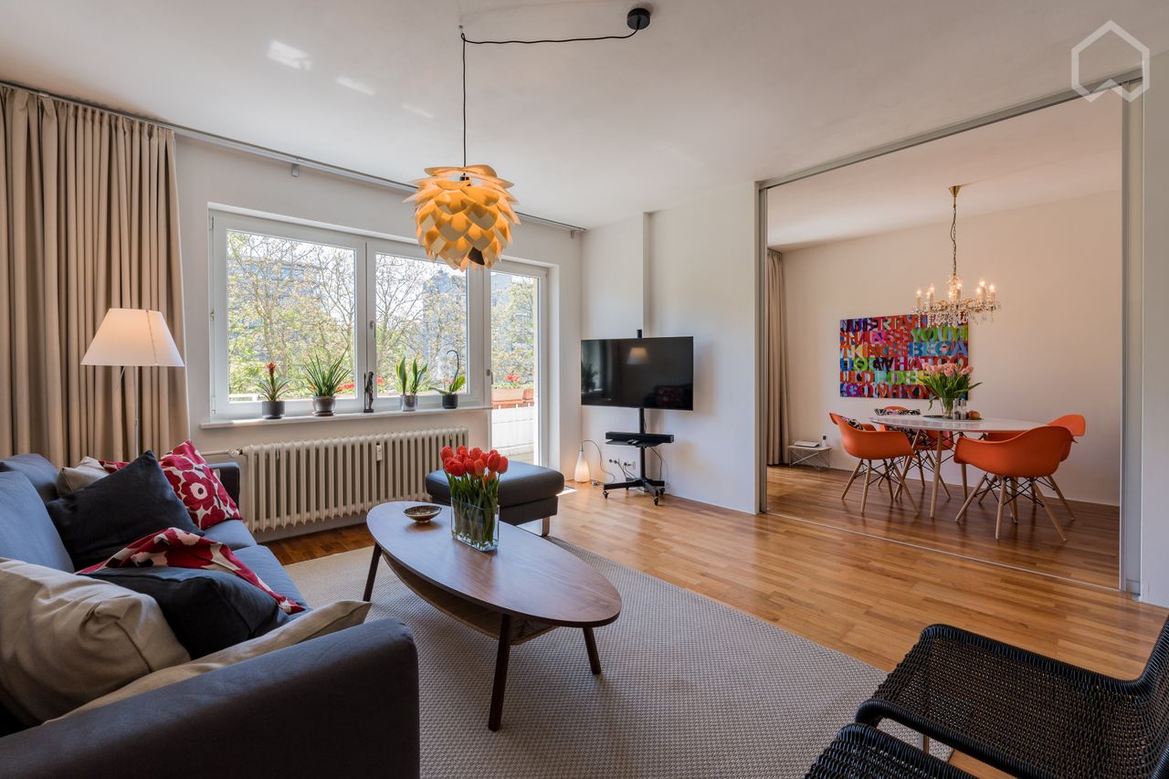 Great cut, comprehensively and stylishly equipped apartment in the heart of Schöneberg. Bathroom: Spacious, ground-level shower (approx. 110 x 130 cm), combined device washer-dryer (AEG). Kitchen with adjoining bar area: fully equipped kitchen with fridge-freezer combination, ceramic hob, stove, dishwasher, espresso machine (all brand appliances), with various other kitchen appliances, LED kitchen underlights, cutlery, crockery, extensive kitchen utensils, wine rack, etagere, etc.. two bar st...