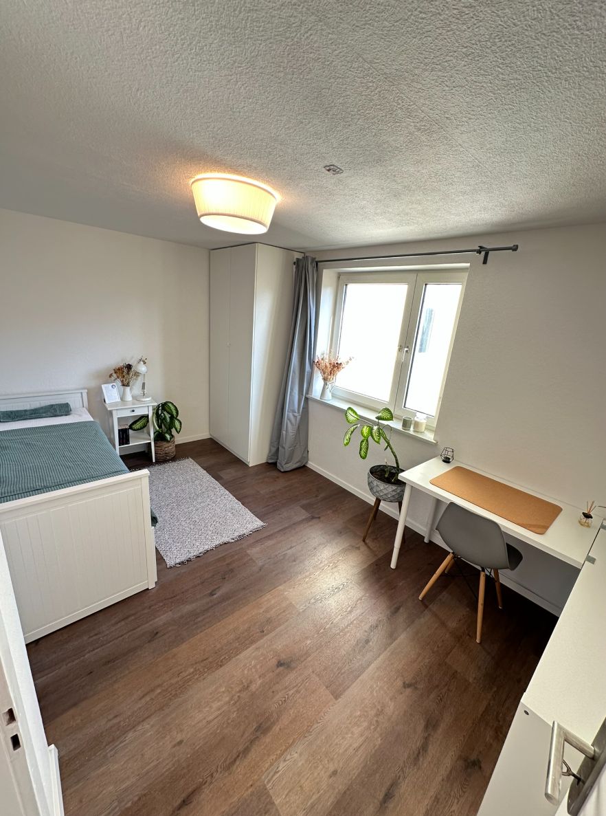 Private room Bright, cozy, furnished shared apartment (total size of shared appartment is 66.5 sqm) with 3 rooms (all rented out separately, see other ads) in the heart of the beautiful city The charming shared apartment is located on the second floor of a well-kept apartment building, nestled in a quiet residential area. The apartment offers everything you need for a comfortable life: Highlights: - Fully equipped kitchen incl. dishwasher. - Bathroom with bathtub (completely renovated and ready...