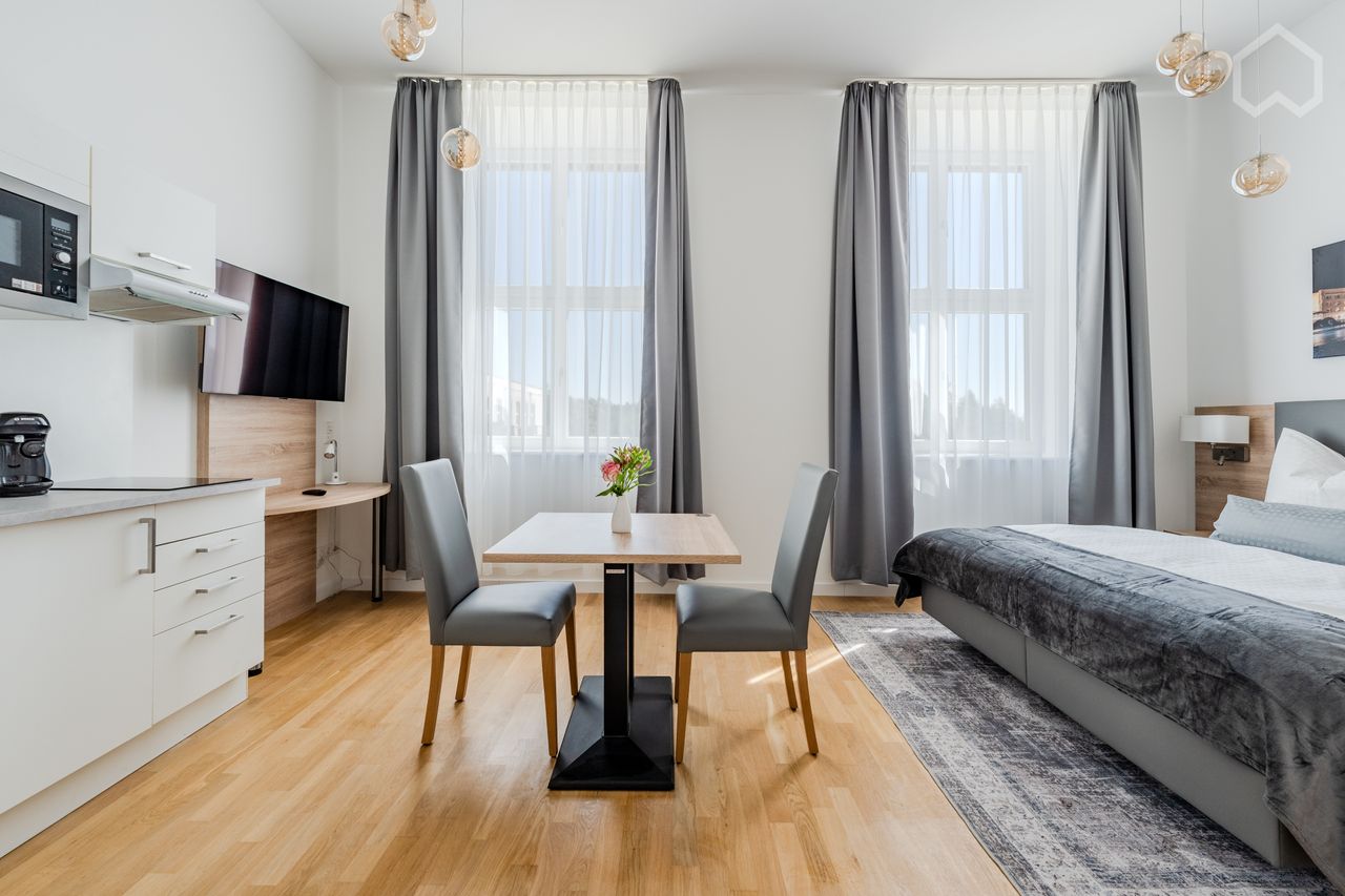 This beautiful, fully furnished studio apartment offers everything you need to enjoy life in Berlin. You find a flat-screen TV, high-speed internet, a fully equipped kitchenette with microwave and fridge, a dining table, a working place and a rain shower in the bathroom. There is a laundromat in the building (approx. €3,5 per wash or dryer cycle). Additionally, the apartment offers: - High-quality parquet flooring - Underfloor heating - Smooth plastered walls - Video intercom system - All uti...