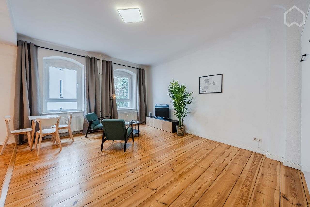 This very bright apartment has about 50 sqm and is located on the 2nd floor in the rear of a typical Berlin old building. The apartment is divided into a large living and sleeping area, with a spacious open kitchen and a bathroom with bathtub. All necessary kitchen appliances and utensils are available. Of course, the apartment has fast internet.