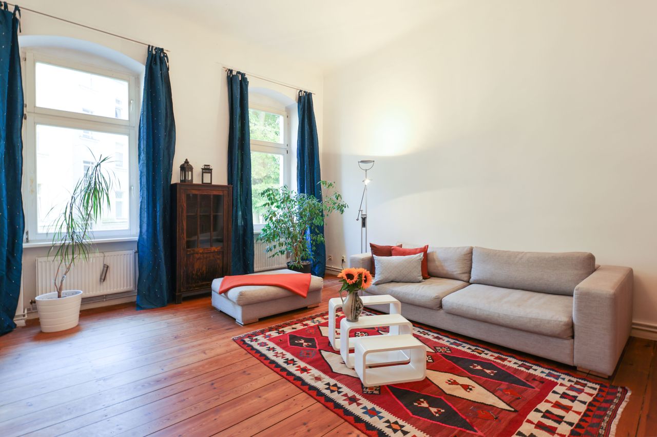 This friendly and to 2 courtyards located two-room apartment with green view is generously cut and is within 5 minutes walking distance to the Bergmann Kiez and yet very quiet. The living room with old fireplace ( deco ) has a cozy L - shaped sofa, with coffee table, standing, reading lamp, flat screen TV, shelves and an antique cabinet. The large bedroom with bed 160 x 200, and 2 antique wardrobes also has a cozy separate reading corner in the bay window. Both rooms have plank flooring. The sh...