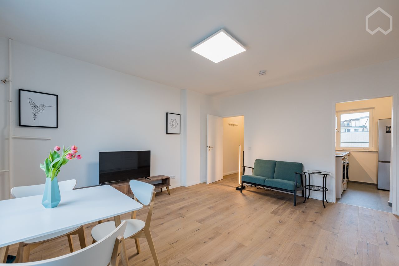 This beautiful apartment is located on the top floor and is therefore very bright. The flat is equipped with a beautiful parquet floor. The living/bedroom is optimally usable due to the foldaway bed. The flat is located directly at the Volkspark Wilmersdorf. The underground and suburban train station Bundesplatz is a few minutes' walk away, so that the U9, S42 bus 101, 248 and M85 lines are all ideally accessible.