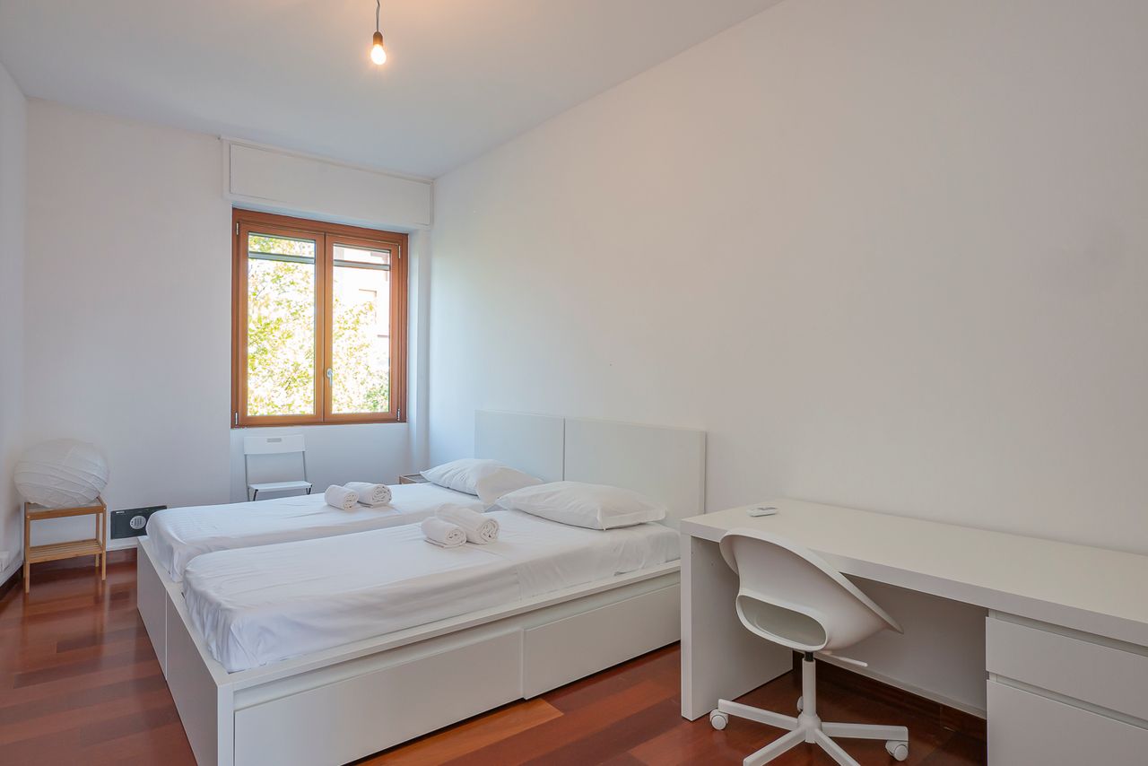 Located on the 5th floor in Via Francesco Brioschi, this bright and functional apartment offers a comfortable stay in one of Milan’s most authentic residential areas. Perfect for those looking for a peaceful yet well-connected location, the property combines practicality with simple, modern living. The bedroom is spacious and filled with natural light, featuring twin beds that can be arranged for flexibility, a clean minimalist design, and a dedicated workspace—ideal for remote work or study. T...