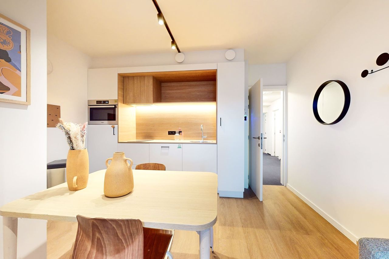 Discover this spacious 36.7 m² duplex studio on the 5th floor of Quai à la Houille, right in the heart of Brussels. Ideal for two people, the space is both comfortable and practical. It features a cozy double bed, a large wardrobe for your belongings, and a well-equipped kitchen with refrigerator, stovetop, and microwave—perfect for preparing your meals. The private bathroom is modern and functional, providing everything you need for your comfort. A highlight of this studio is the balcony, wher...