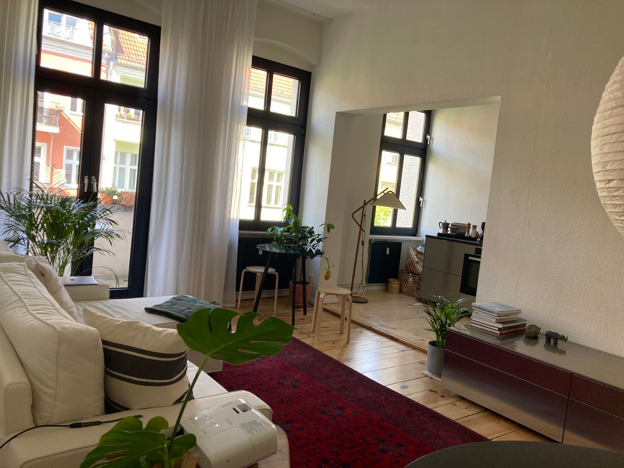 A fully-furnished and centrally-located flat located in Sonntagstr. in Friedrischain, a lively area with plenty of cafés, restaurants, bars, and supermarkets (including one of the very few that is open on Sundays!). The flat is very bright on the 3rd floor and with a balcony. The flat comprises two rooms: a living/dining room opening onto the kitchen, a bedroom with working space and a spacious bathroom. The flat has all the necessary amenities such as washing machine, dishwasher and kitchenwar...
