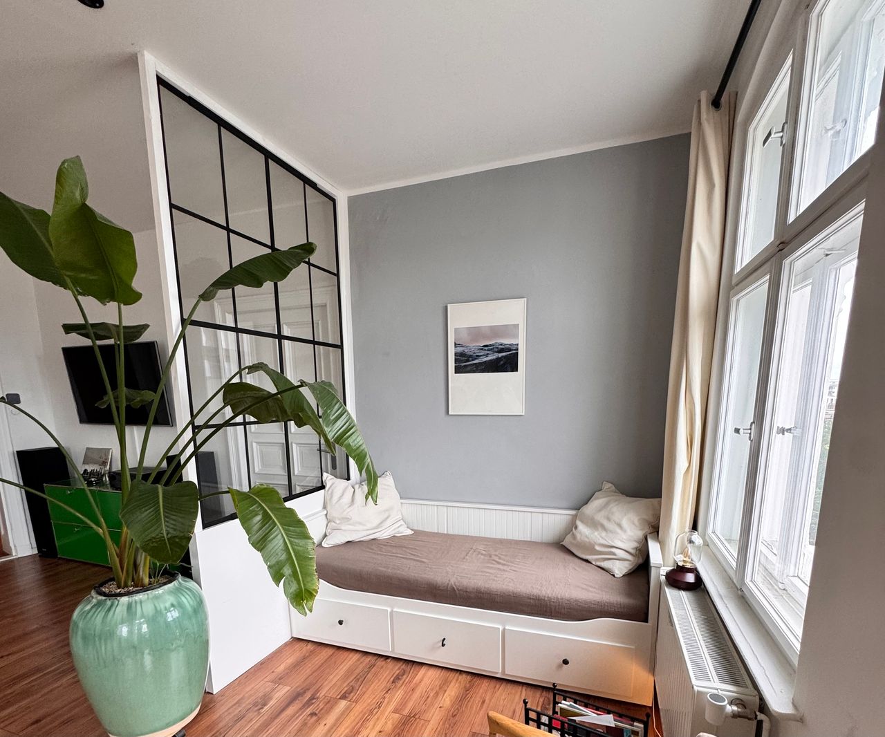 Bright, stylish apartment with 2 generously sized rooms in the popular Hausburgviertel. The high ceilings, double windows and coffered doors provide the typical Berlin Altbau charm. In the living room there is a large dining table, a comfortable seating area, a stereo system and TV. In addition, a well-equipped home bar and a daybed that can be extended to a comfortable sofa bed for 2 people. Adjacent to the living area is a balcony on the east side with beautiful, expansive views. The bedroom...