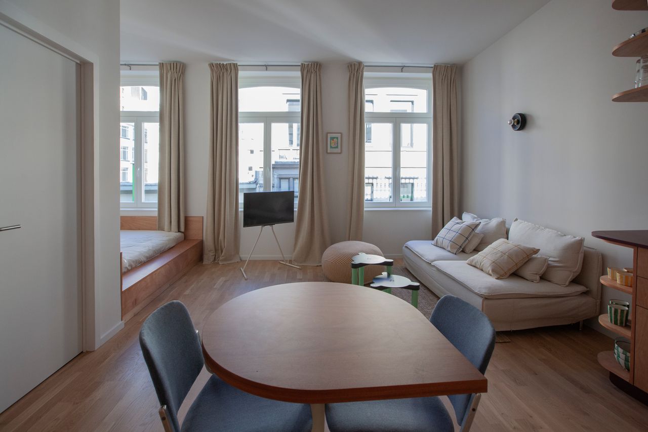 Tucked away on a serene street in the ultra-chic Goulot Louise neighborhood, this studio (4th floor, no elevator) is a self-contained oasis with its kitchen, living room, dining nook, bedroom and bathroom. You also have access to top-tier communal spaces, including a huge kitchen, dining room, a garden, a fitness and yoga room. Set in one of Brussels’ most coveted districts, you’ll be steps away from designer boutiques, gourmet restaurants, and the buzzing energy of Avenue Louise.