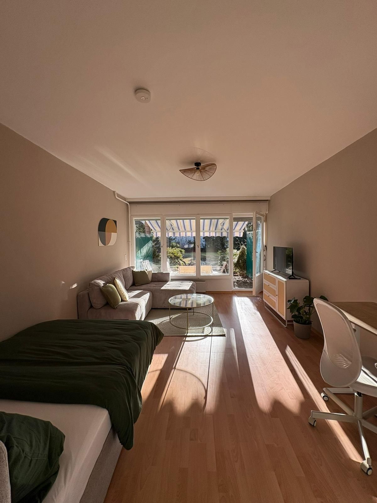 The living and sleeping areas are open plan, with a separate kitchen. The apartment is fully equipped and ideal for professionals, expats, or project staff who want to live comfortably for a limited period of time—without the stress of furnishing. Amenities & Highlights • Terrace with outdoor furniture + garden • Additionally: adjacent, well-maintained communal garden • Newly renovated, new kitchen & new furniture • Open-plan living/sleeping area with sofa, TV & 140 cm bed • Large war...