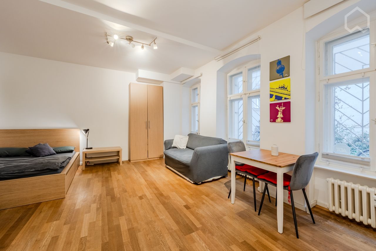 Welcome to your new home! This newly renovated apartment is located on the first floor of a well-kept garden house in the heart of Berlin. Despite its central downtown location, you can enjoy absolute peace and quiet and a pleasant temperature - even on hot summer days. Room layout and furnishings This bright and well-designed 1-room apartment offers everything you need for comfortable living: Living and sleeping area: The combined living and sleeping area is furnished with a cozy double bed,...