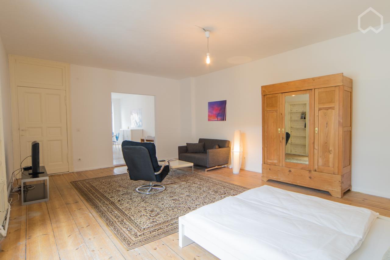 * Deutsche Beschreibung unten This comfortable 2-bedroom apartment in Kreuzberg stands out especially for its stylish interior. Wooden floors and high ceilings make the apartment cozy and bright at the same time. The bedroom is separated with the living room by a double wing door. Especially practical is that the apartment is not only fully furnished, but there is also no lack of practical equipment: Even bed linen, towels and spices are available.This facilitates the arrival! The location of ...
