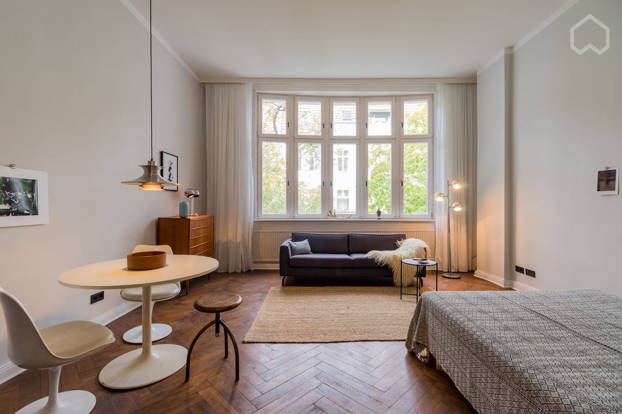 Charmante Atelier Wohnung in einem imposanten Charlottenburger Altbau der Gründerzeit mit Liebe zum Detail neu saniert. Möbliert in modernem Midcentury Style. Ungewöhnlich großes Fenster mit Blick in die Bäume und auf eine schöne Berliner Hausfassade, 3.50 hohe Decken, historische Eichendielen in Fischgrät verlegt, gespachtelte Wände in hellgrau, Pantryküche mit 2er Induktionsplatte, Kühlschrank, Geschirr, Besteck, Töpfen, WMF Toaster, WMF Wasserkocher und Teak Schüsseln. Bad in Naturstein mit G...