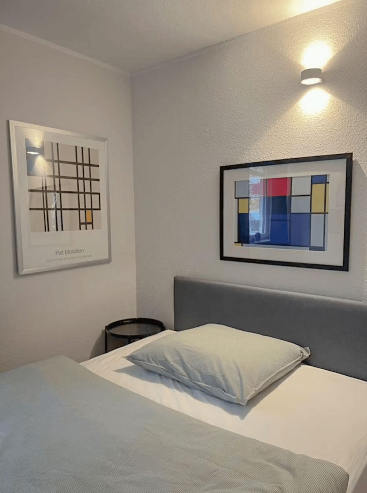 Please keep in mind that the 480€ cleaning fee + 480€ non-deposit fee have to be paid BEFORE moving in. This is an unlimited contract with 1 month notice. This is one of the 3 bedrooms in the apartment THE ROOM: The room equipped with a king-sized box-spring bed with fine bedding, one bedside tables, one bedside lamp, a large closet, and a working desk with a corresponding chair. In addition to your own room, you and your flat-mates share a spacious kitchen. Moreover, the kitchen is fully fitt...