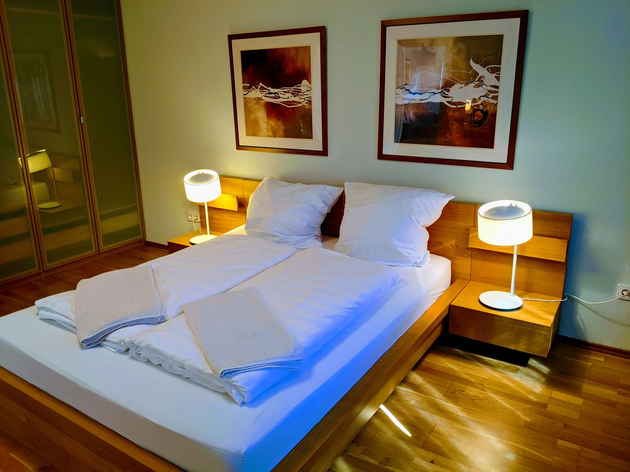 Up to three people can be accommodated on 70 square meters. The division into a spacious living room and two relatively equally large bedrooms is ideal for families as well as business partners. The apartment is on the third floor of an apartment building. In sunny times, the large balcony at the back of the house with table and chairs invites you to relax. Of course, we wash the bed linen including pillows and blankets thoroughly for each guest after each stay.