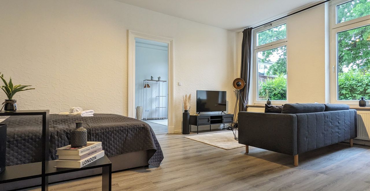 Welcome to our charming ground floor vintage apartment with two cozy rooms! Room 1: Bedroom and living room with a queen-size box spring bed, couch, and Smart TV. Room 2: Office and bedroom with 3.5m high ceilings, a workspace, and a queen-size double bed (1.6m ceiling heigt). Kitchen: Gas stove, dishwasher, and Nespresso coffee machine. Full bathroom with washing machine. Dedicated parking space. Close to Hamburg, clinics, stadium, and arena. Ideal for relaxation and activities!