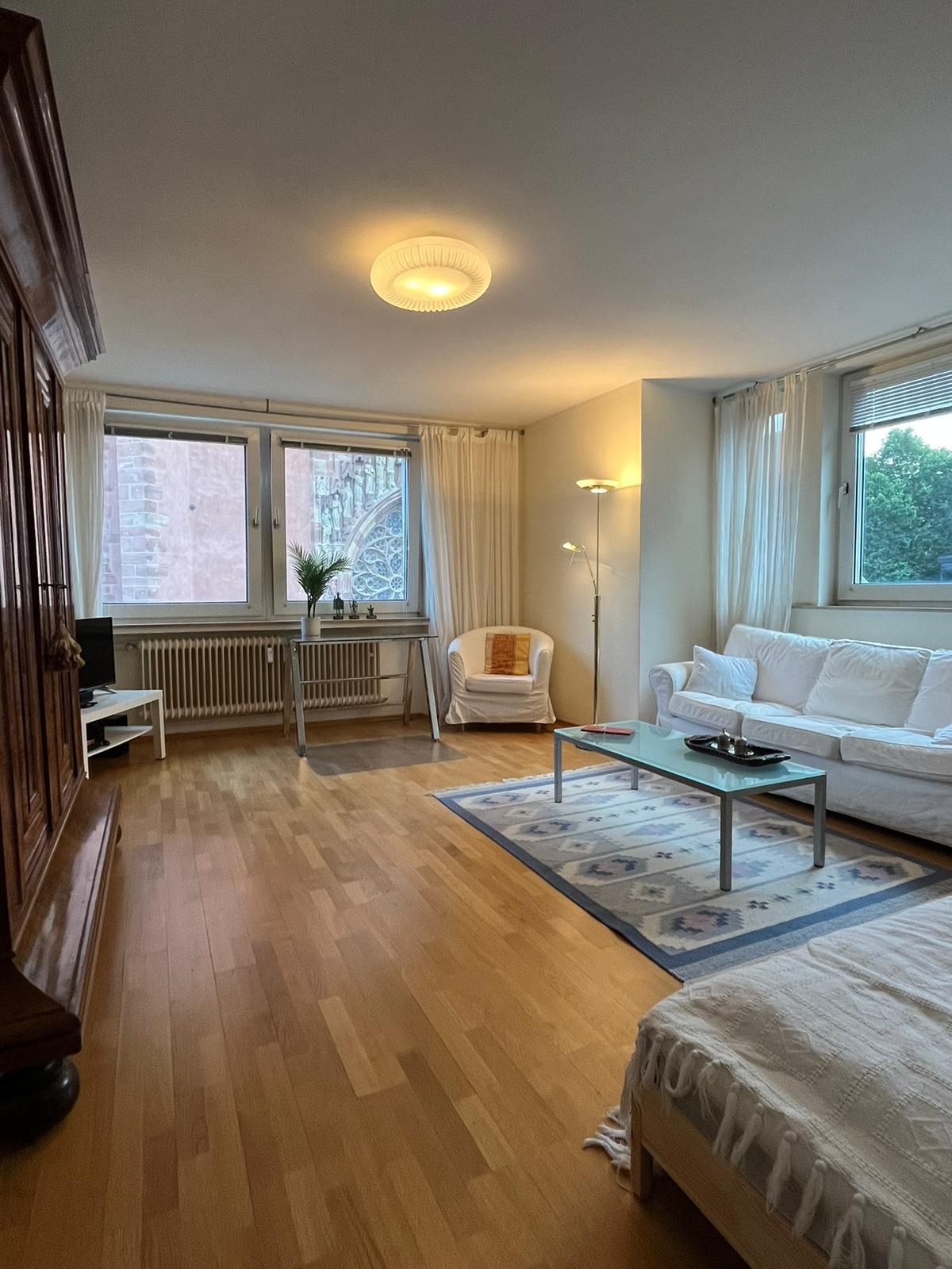 Elegant fully furnished flat with beautiful views of the cathedral (Dom). The apartment is located in the very heart of the historical city center next to a scenic square. Within two minutes walking distance you reach the tube/subway and in 3 minutes the "Römer" and the Zeil shopping district or the river. The flat is divided into 2,5 rooms: one bedroom with a desk, one living/ or bedroom with a desk and a dining area with a kitchen. It is fully furnished and equipped, so to speak "ready to move...