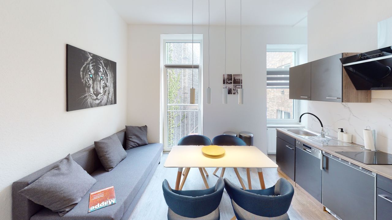 We offer a fully furnished and extensively modernized apartment on the 1st floor in the Mannheim inner city / Jungbusch. The equipment of the fully furnished apartment includes: • Spacious bedroom of about 15 sqm with double bed, bedside table, large wardrobe, desk and swivel chair, Samsung Smart TV with Amazon Firestick • Dining and living room with fitted kitchen of approx. 12.5 sqm with French balcony, sofa bed (space for 1-2 people), dining table with 4 chairs, washer-dryer from AEG • Fully...
