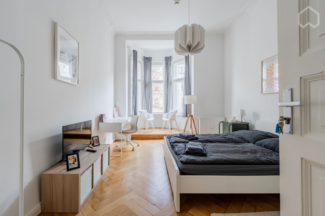 Very nice modern (4 room) shared flat in Friedrichshain. Ostkreuz S-Bahn station is only two minutes away from the flat. The sunny room consists of a large bedroom with a cosy corner seat, a double bed 140x200 as well as a TV and a wardrobe for storing clothes. The kitchen and bathroom are shared with other guests. The kitchen is equipped with a fitted kitchen. Modern furnishings, individual furnishing style. Guests have access to a washing machine, dishwasher and shower room. Flatscreen TV set...