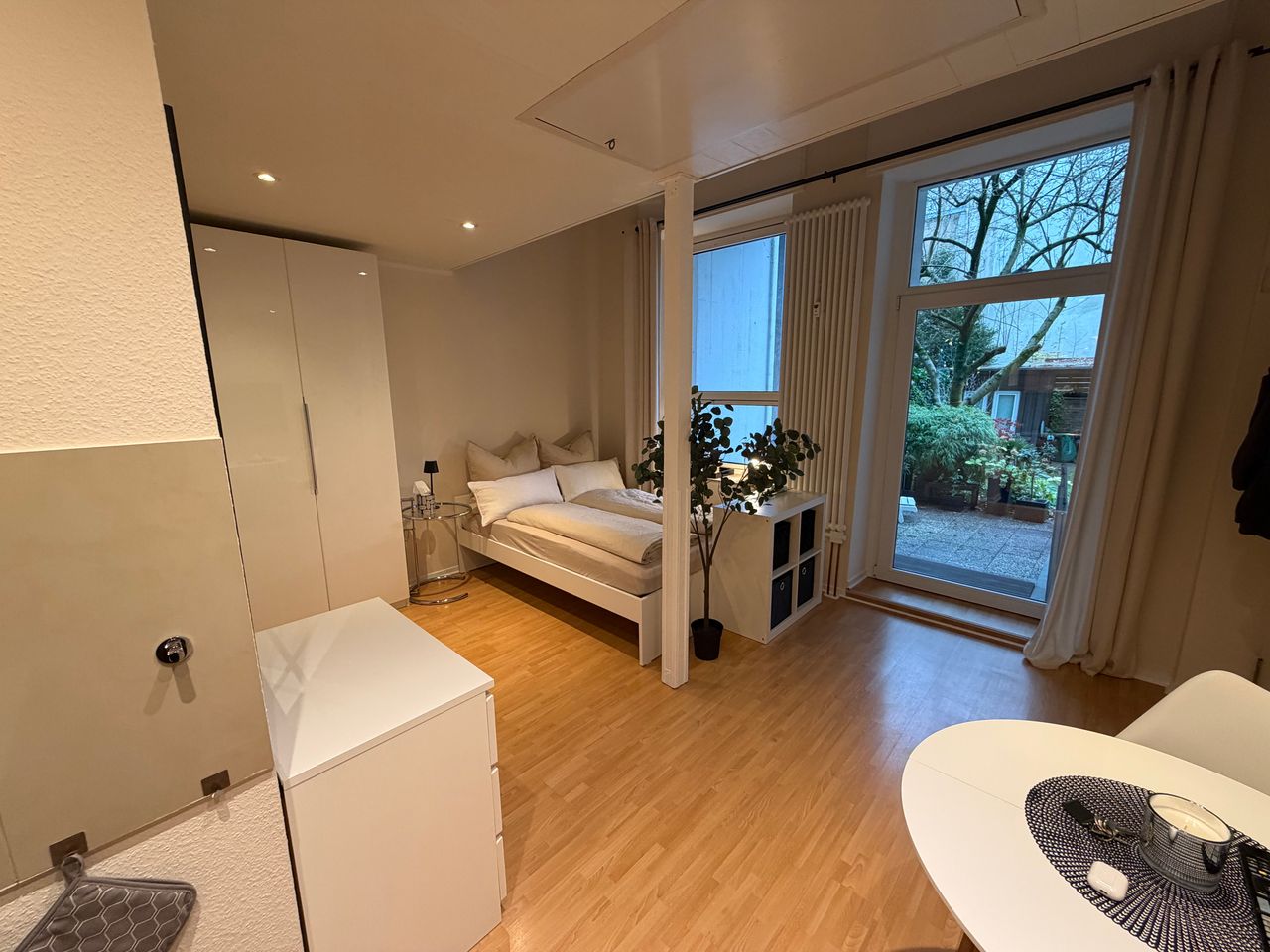 Approx. 30 sqm, ground floor, large terrace facing greenery. One room with pantry kitchen and bathroom, located in Düsseldorf, Unterbilk. Well-kept, quiet building. Washing machine and dryer available for personal use in the basement. All costs included.