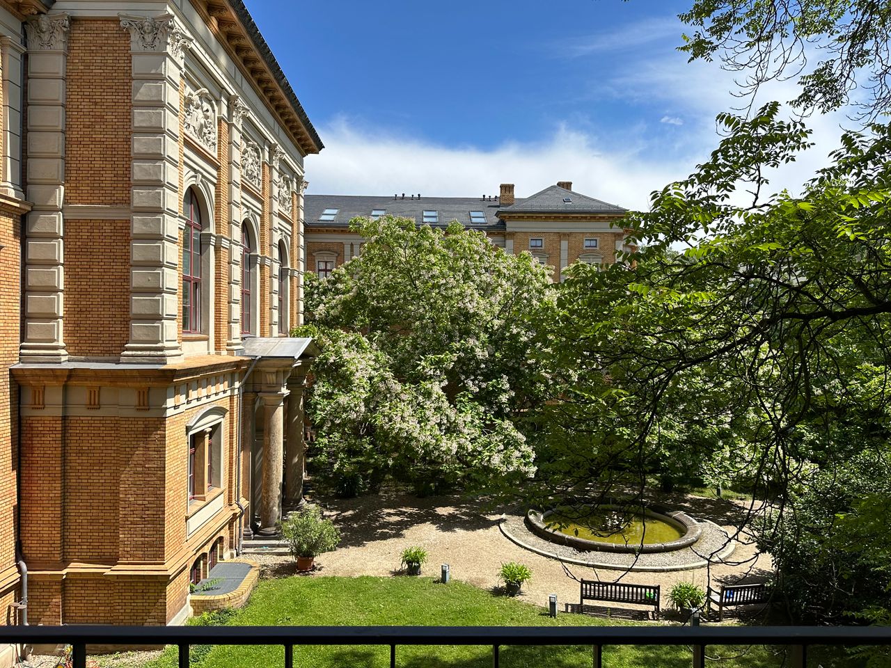 The apartment has a shower room, an open, fully equipped kitchen including a washer-dryer and an open living and sleeping area. The balcony opens up a view of the fountain and the stately entrance area of the historical ensemble. The park-like garden with seating, lawn and children's playground can of course be used. An underground parking space is available upon request.