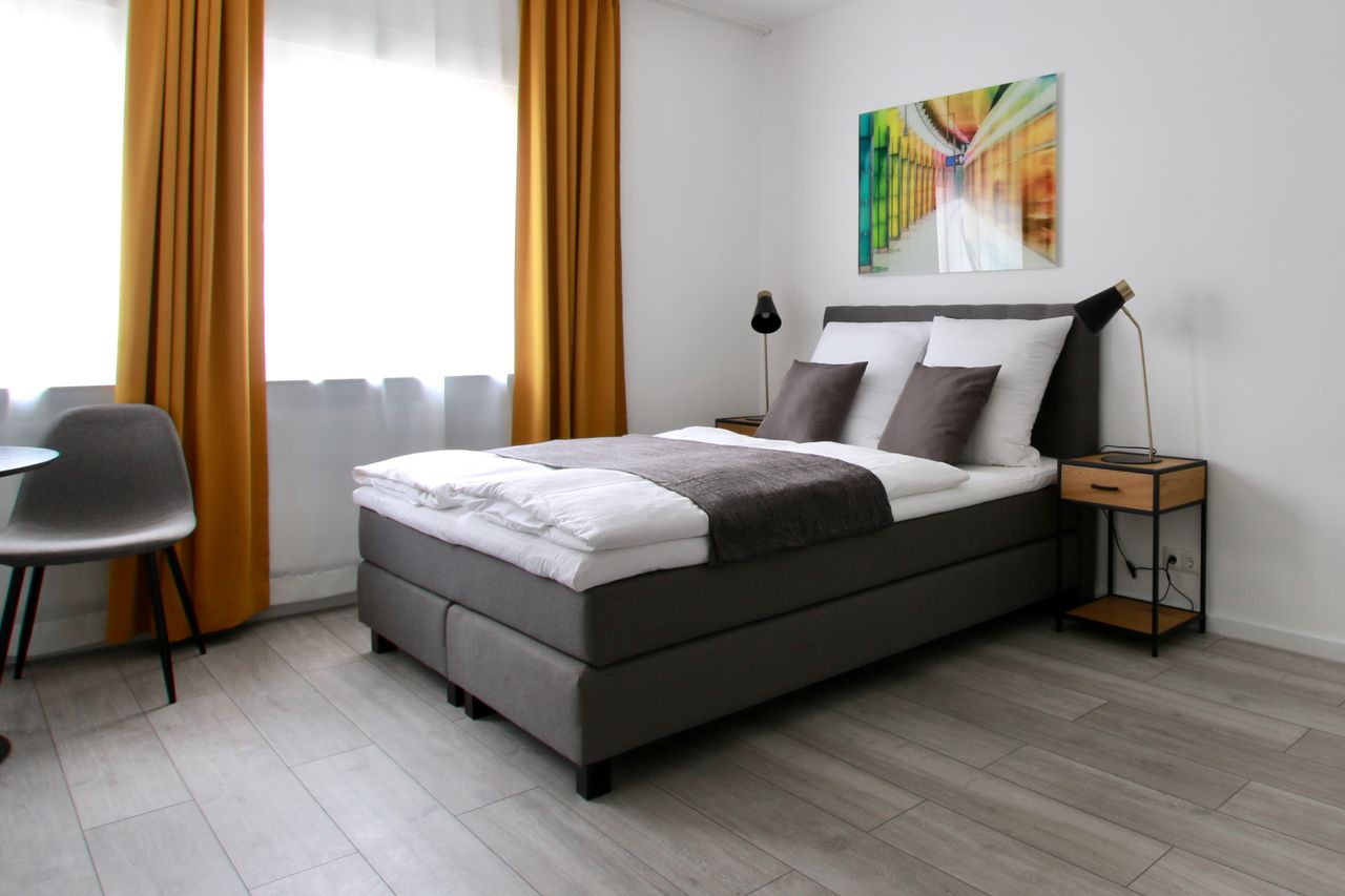 25 sqm studio apartment on the 3rd floor of a 4-story apartment building in a side street of the Belgian Quarter, close to the Ring. The small living space with laminate flooring has a new box spring bed (160 cm width), wardrobe, ironing board & iron, TV, dining table, and a new, fully equipped kitchenette with refrigerator, stove, kettle, microwave, and coffee maker. The modern bathroom comes with a shower and hairdryer. Free Wi-Fi is available. There is a laundry room with coin-operated wash...