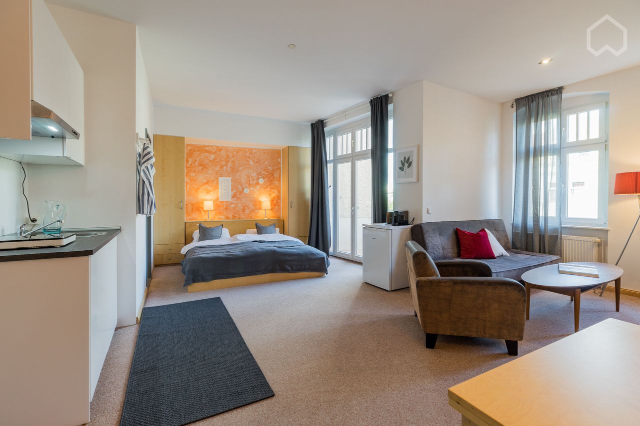 ///ENGLISH VERSION BELOW/// AUSSTATTUNG Das geräumige komplett möblierte 1-Zimmer Apartment eignet sich ideal für ein bis zwei Personen und befindet sich im grünen, ruhig gelegenen Berliner Stadtteil Tegel. Im Eingangsbereich des Apartments befindet sich eine neue Küchenzeile bestehend aus einem mobilen Induktionskochfeld, Dunstabzug, Mikrowelle, Spüle Kühl- und Gefrierschrank sowie einer Waschmaschine bietet eine große Auswahl an Küchenequipment, welches Sie zur Zubereitung diverser Mahlzeit...