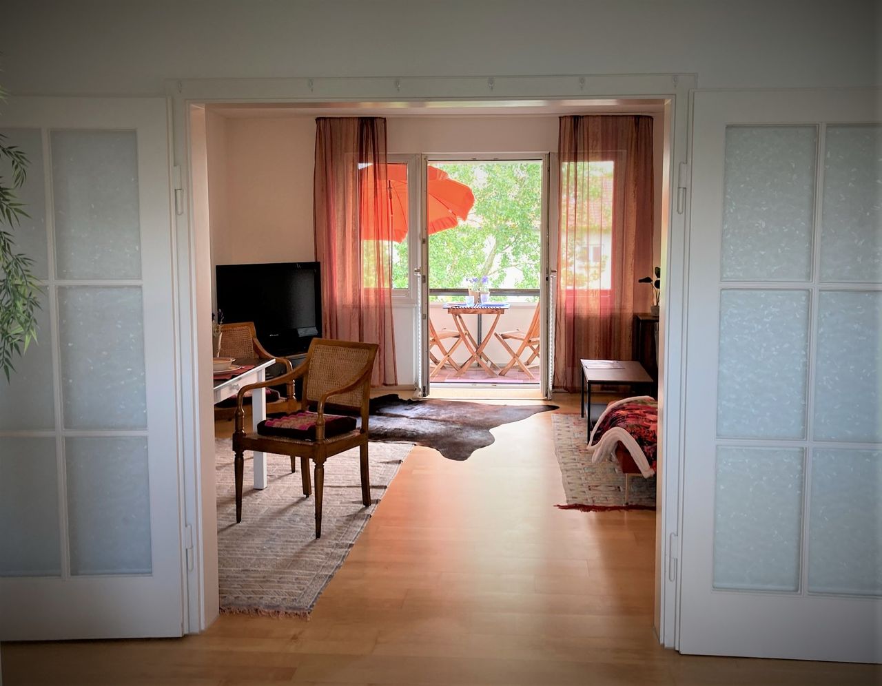 Living near to nature, and with short ways whereever you want to go: fully equipped, spacious and charming apartment awaits you. The entrance area already offers plenty of space and storage. The three large rooms are ideal for a couple or a single person: The spacious bedroom with double bed offers plenty of closet space, its own access to the balcony and a small couch for reading or taking a nap. From the living room with big sofa and dining area you step through the double door onto the sunny...