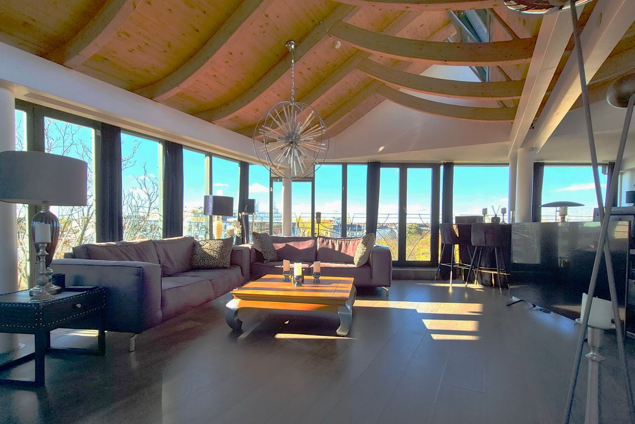 Luxurious penthouse apartment with underfloor heating, unobstructed views in all directions, and underground parking space. Enjoy an incomparable living experience in a spacious 2-room apartment with two roof terraces (approx. 50 sqm). Exclusively floor-to-ceiling windows in three directions, including south/west, with ceiling heights between 2.80 and 4 m ensure light-flooded rooms with an unobstructed view of the Berlin Radio Tower and a large garden with mature trees, as well as towards the Ol...