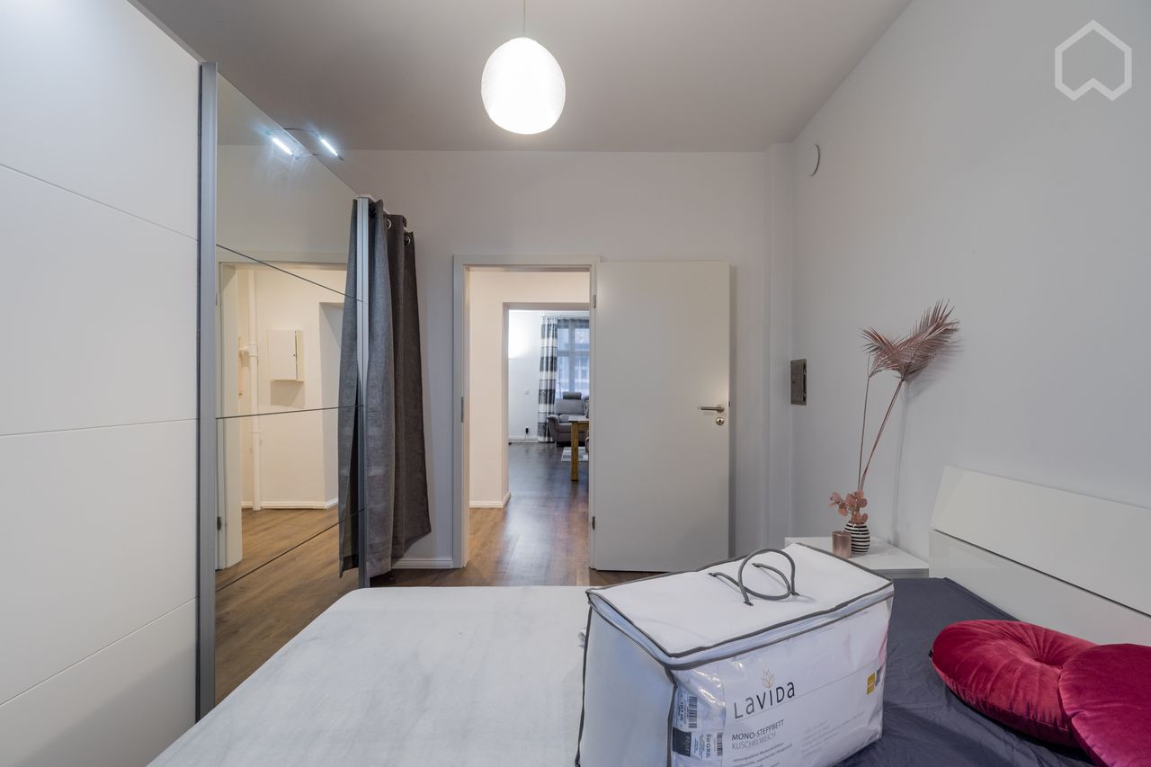 The elegant apartment is situated in a calm street of trendy Friedrichshain The bedroom, which opens onto the garden, features a spacious double bed (1.80 m wide) and a large wardrobe. The location is ideal for singles and couples who want to enjoy the advantages of the city. The Straßmannstraße (approx. 260 m) and Bersarinplatz (approx. 340 m) tram stops are in the immediate vicinity, providing quick access to Berlin's public transport network. Supermarkets, shops, and numerous restaurants ar...