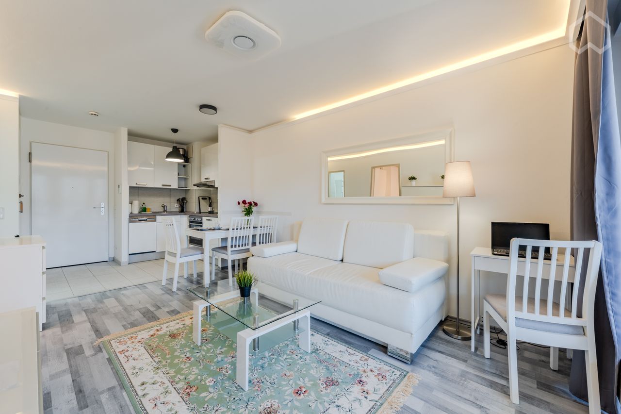 Highlights • Dream location between Gendarmenmarkt and Checkpoint Charlie • Sunny balcony with a view of the Berlin TV Tower • 24/7 concierge service, elevator, underground parking (additional charge: €130 per month) • Fully equipped kitchen, smart TVs in the living room and bedroom, bathroom with bathtub and washing machine • Blackout curtains, storage room in the attic, on-site laundry Amenities • Bedroom with a comfortable double bed (160x200 cm) and a spacious wardrobe • Open-plan living ar...