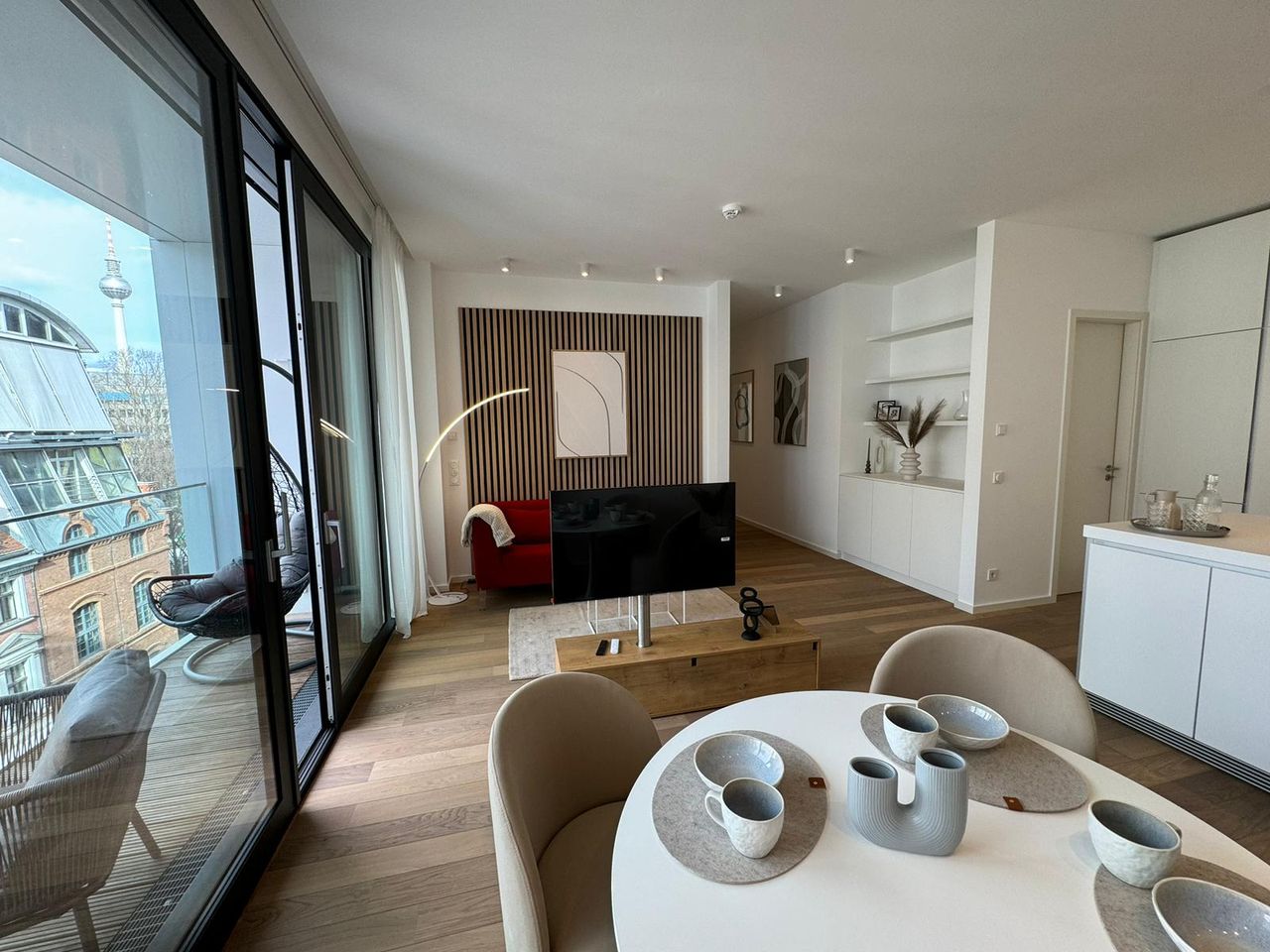 Welcome to your new home in the heart of Berlin Mitte! This charming and fully furnished two-room apartment not only offers an ideal location, but also a breathtaking view of the television tower. The spacious balcony invites you to relax and enjoy the city landscape. A brand new, spacious Bulthaup kitchen invites you to cook and enjoy. Everything is available down to the last detail (dishes, pots, pans, glasses, kitchen appliances and washer-dryer). A beautiful sleep-work area with a great view...