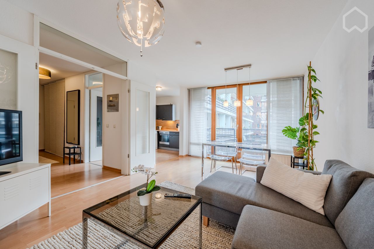 Bright, fully furnished 83 m² apartment in a modern building with two balconies & water view: • 2 bedrooms (boxspring beds: 200 / 160 cm) • Separate home office (desk, ergonomic chair – ideal for remote work) • Open-plan living/dining area with 90 cm smart TV • Fitted kitchen with washing machine & dishwasher • Bathroom with natural light, bathtub & shower Wi-Fi, elevator & parking. 5 min to Ostkreuz (S-Bahn, tram & buses). Alexanderplatz in 10 min, Airport in 21 min.