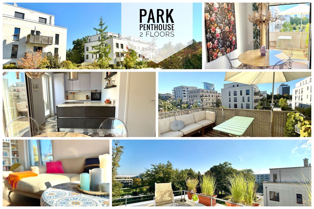 Fully furnished penthouse over two floors. All amenities are available. The apartment is extremely bright with a roof terrace and a balcony. The terrace overlooking the park is facing east and makes the apartment a unique oasis of well-being in the heart of the city. The apartment consists of several bright, light-filled rooms. Features: - Large penthouse living room with terrace overlooking the park - 1 master bedroom - 1 children's bedroom (alternative: guest bedroom) - 2 showers and 2 toi...