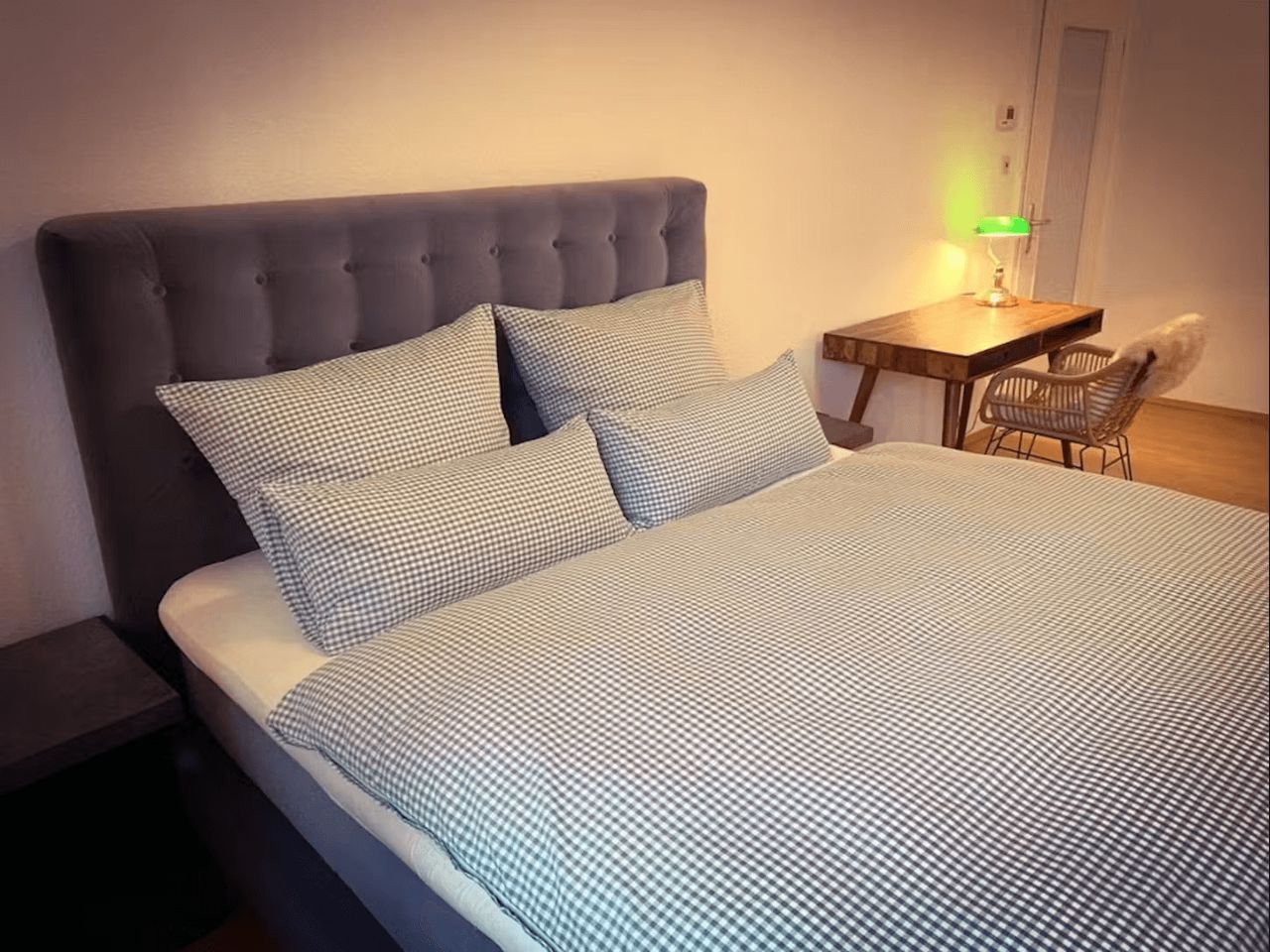 Please keep in mind that the 480€ cleaning fee + 480€ non-deposit fee have to be paid BEFORE moving in. This is an unlimited contract with 1 month notice. This is one of the 3 bedrooms in the apartment. The room is furnished with a king-sized box-spring bed with fine bedding, two bedside tables, green velvet curtains, a green velvet armchair, a chest of drawers, a wardrobe, a shelf, a floor lamp, a reading lamp, a working desk, and a corresponding working desk chair. The room is very spacious ...