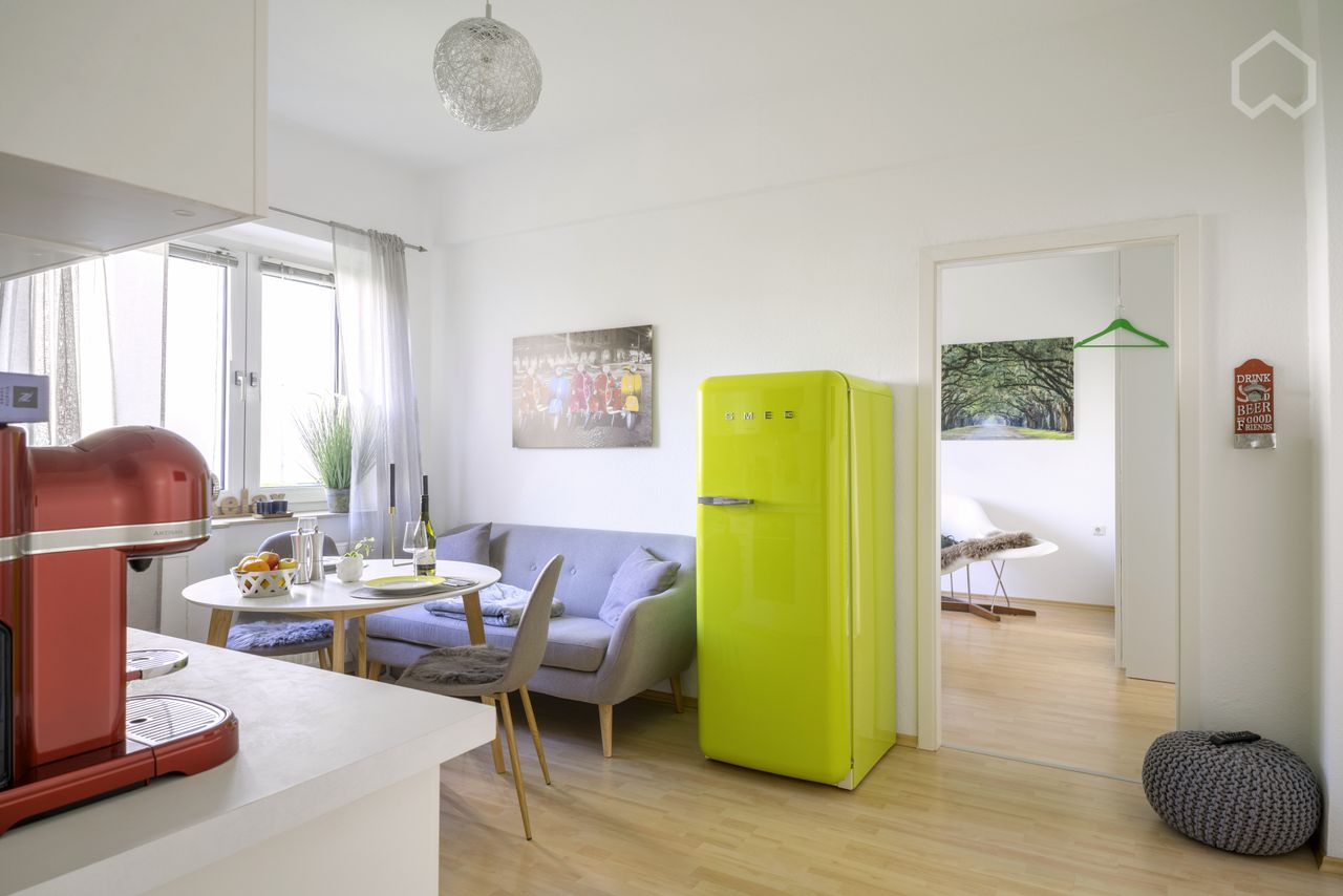 Objektbeschreibung Zur Vermietung steht eine toll geschnittene 2 Zimmer-Wohnung im wunderschönen Klettenberg, die frisch renoviert und mit hochwertigen Möbeln neu ausgestattet wurde - mithilfe einer Interieur-Designerin.. Sie liegt im Erdgeschoss eines sehr gepflegten Altbaus, Duschbad mit Fenster und Handtuchwärmer, neue weiße Küche (komplett modern und hochwertig ausgestattet mit Spülmaschine) mit einem Sofa und TV (Internet), Tisch und Stühlen, einem frischen grünen smeg Kühlschrank, einem se...