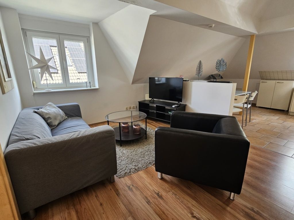 Modernly furnished apartment for 2 people with every comfort in a quiet location in the beautiful Französisch Buchholz (Pankow) district. Two bedrooms, a living area with an open, fully equipped kitchen, a hallway, and a bathroom with a bathtub await you. This attic apartment in a single-family home offers a total of approximately 75 square meters of living space. The apartment is ideal for shared accommodation. - Living area with satellite TV, radio, couch/armchair, kitchen table with 4 chairs...