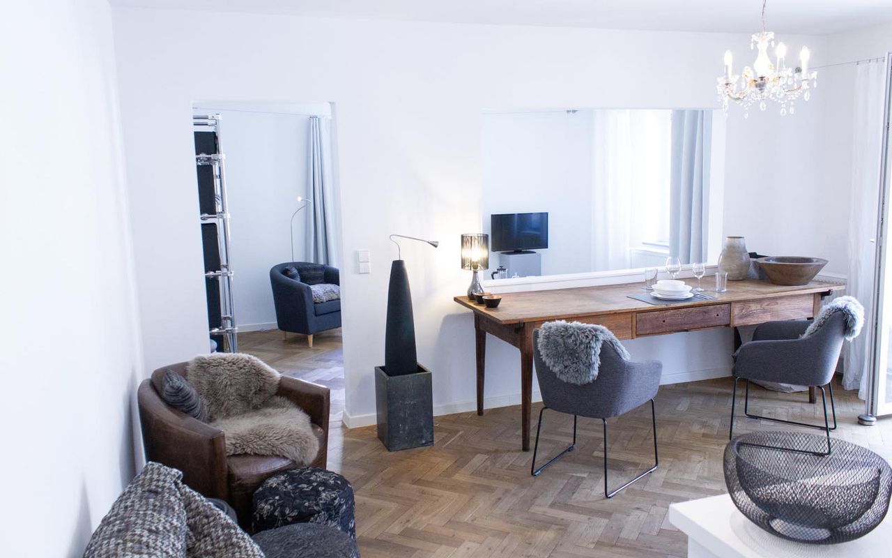 Deutsch Einzigartig möbliert Wohnung im beliebten Stuttgarter Westen. Mit viel Liebe und Geschmack aufwendig renoviert. Austattung: Eiche Fischgrät Parkett Wohnzimmer Sitz-Liegekissen mit Pouf in Camouflage Design, schwarz gecovert Bequemer Sessel Kupfer Beistelltisch Großzügiger antiker Holz-Esstisch mit armlehn Stühlen, charmant patiniert Einbauküche voll ausgestattet Schlafzimmer Ergonomisches Doppelbett (180×200) Selbstgestalteter Kleiderschrank, Schattenmuster-Lampe Schubladenschrank ...