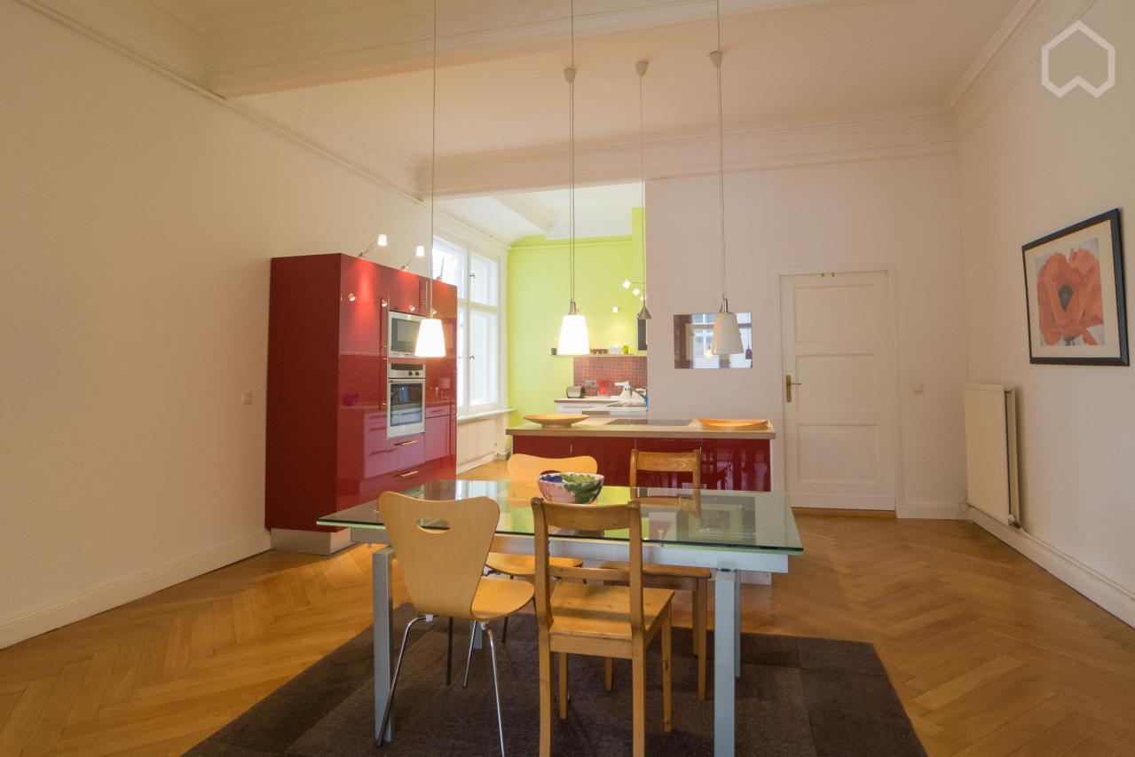 This huge and fully furnished apartment provides enough space for a couple or also small families with one or two children. The furniture includes everything you need for the daily life, so you just have to take your clothes and move in. The opulent 126qm located in “Regensburger Straße” are fascinating with it’s stucco and high walls. Also, you could name the different lusters and leaf doors as extraordinary. This place is really special. If one day the sun might shine, you can also go outside...
