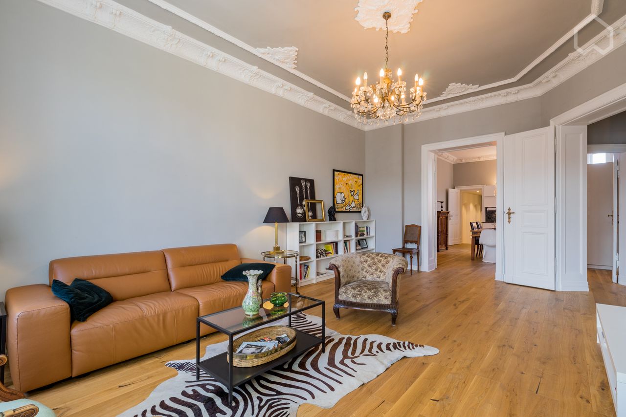 Wonderful old building apartment in Berlin Tiergarten. High ceilings, unique furniture and a classic tiled stove make this apartment a wonderful temporary home. The large living room with comfortable leather couch and high light-giving windows invites you to relax in the evening. A wide passageway leads to the spacious kitchen which offers all the amenities for a quick breakfast as well as a dinner menu. The dining table offers space for up to 6 people. Next to the living area is the main b...