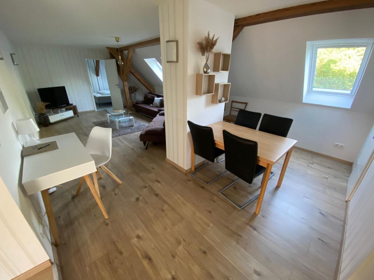 This fully furnished apartment with approx. 75 sqm is located in Groß Zastrow near Greifswald and offers a peaceful living environment surrounded by nature. The apartment is ideal for professionals, project workers, couples or small families looking for a comfortable temporary home. Situated on the top floor, the apartment features exposed wooden beams, bright rooms and a warm, welcoming atmosphere. The spacious living and dining area is tastefully furnished and provides plenty of space for bot...