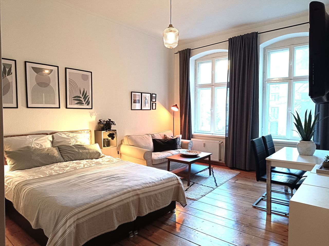 This is a stylish classic Berlin apartment, perfectly located at the heart of the Friedrichshain district. The apartment is located in the inner wing of the building and overlooks the quiet inner courtyard. It is fully furnished and ready to move in. It contains one living room, separate and fully fitted kitchen (with microwave, dishwasher, coffee maker, toaster, kettle) and a bathroom (with washing machine). All added expenses are included. Entire apartment: -Luxury 1 room apartment availabl...