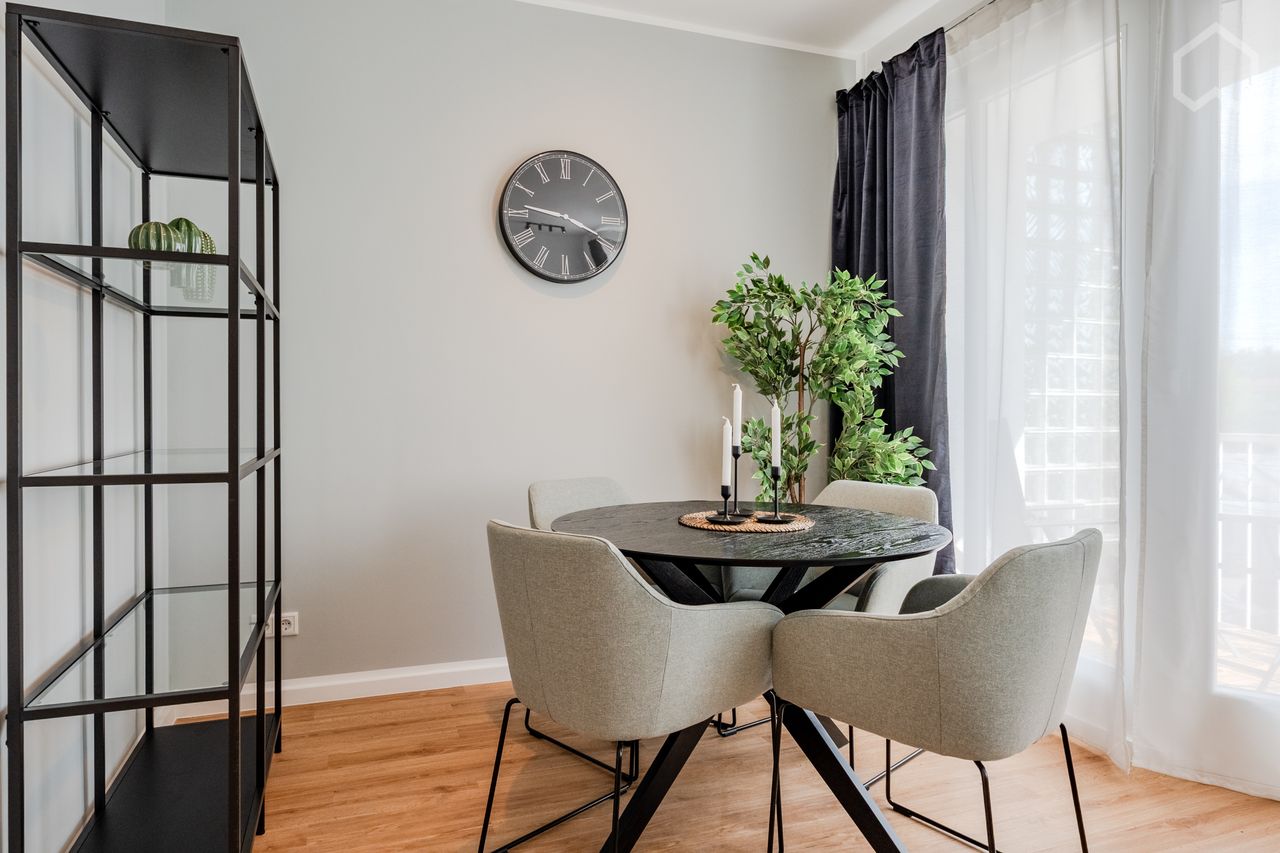 This stylish and modern apartment offers the perfect retreat for discerning guests seeking comfort and functionality in an attractive Berlin setting. With its open, light-filled layout, the apartment combines modern living comfort in an elegant way. The open kitchen forms a harmonious unit with the living and dining areas. The modern fitted kitchen is equipped with high-quality appliances and leaves nothing to be desired – ideal for preparing meals that can be enjoyed in the adjacent dining are...