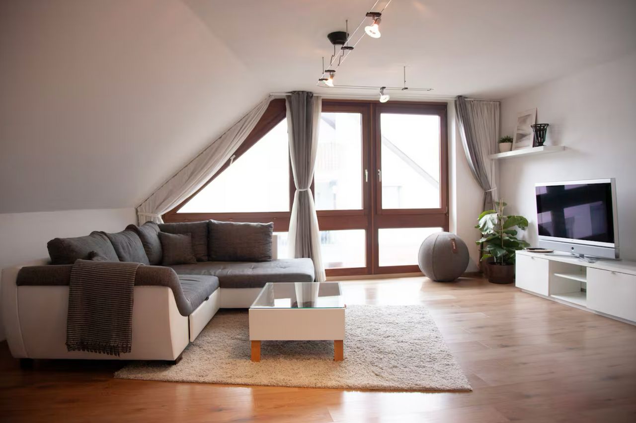 Bright, friendly attic apartment/granny flat on the second floor Large windows in three directions including a balcony. The apartment consists of a very attractive, large living room with an open dining area. The windows in the bedroom and living room go down to the floor. In addition to the 7sqm balcony (southwest facing), the bedroom has a French balcony (west). The balcony invites you to relax and soak up the sun. There is also storage space in the basement and a storage room directly i...
