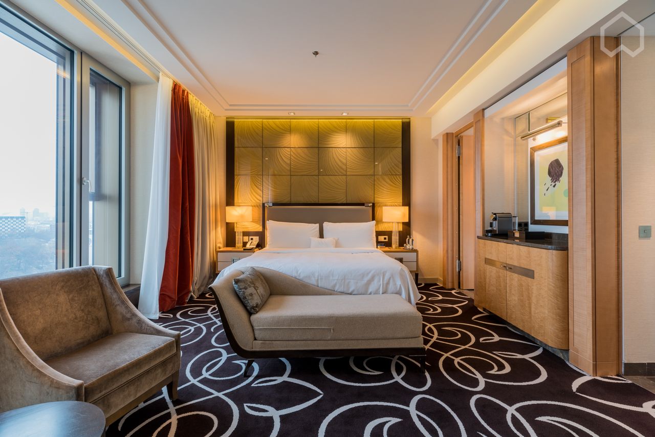 TIMELESS ELEGANCE Let your gaze wander over the breathtaking skyline of Berlin. The first-class elegance and sophistication inherent in our traditional style is reflected in this Suite, which comes with a selection of exclusive amenities and services. Experience pure luxury in this Junior Suite with a king-size bed and stunning panoramic views of Berlin. Prepare a meal in the fully equipped kitchen and entertain friends and family in the separate living and dining area with dining table. Afte...