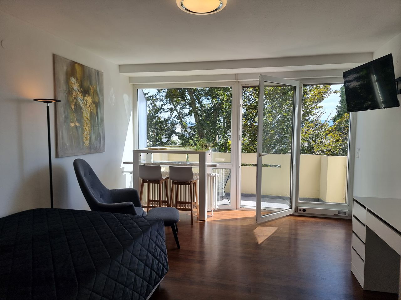 The bright apartment with large panoramic windows offers a cozy atmosphere for relaxation. Modernly furnished and conveniently located, it is ideal for both leisure and business stays. Shops, restaurants, and the city center are within easy reach. A private parking space is available directly at the building. Enjoy your coffee on the sunny balcony overlooking greenery. Comfort and a perfect location in the beautiful city of Schwetzingen.